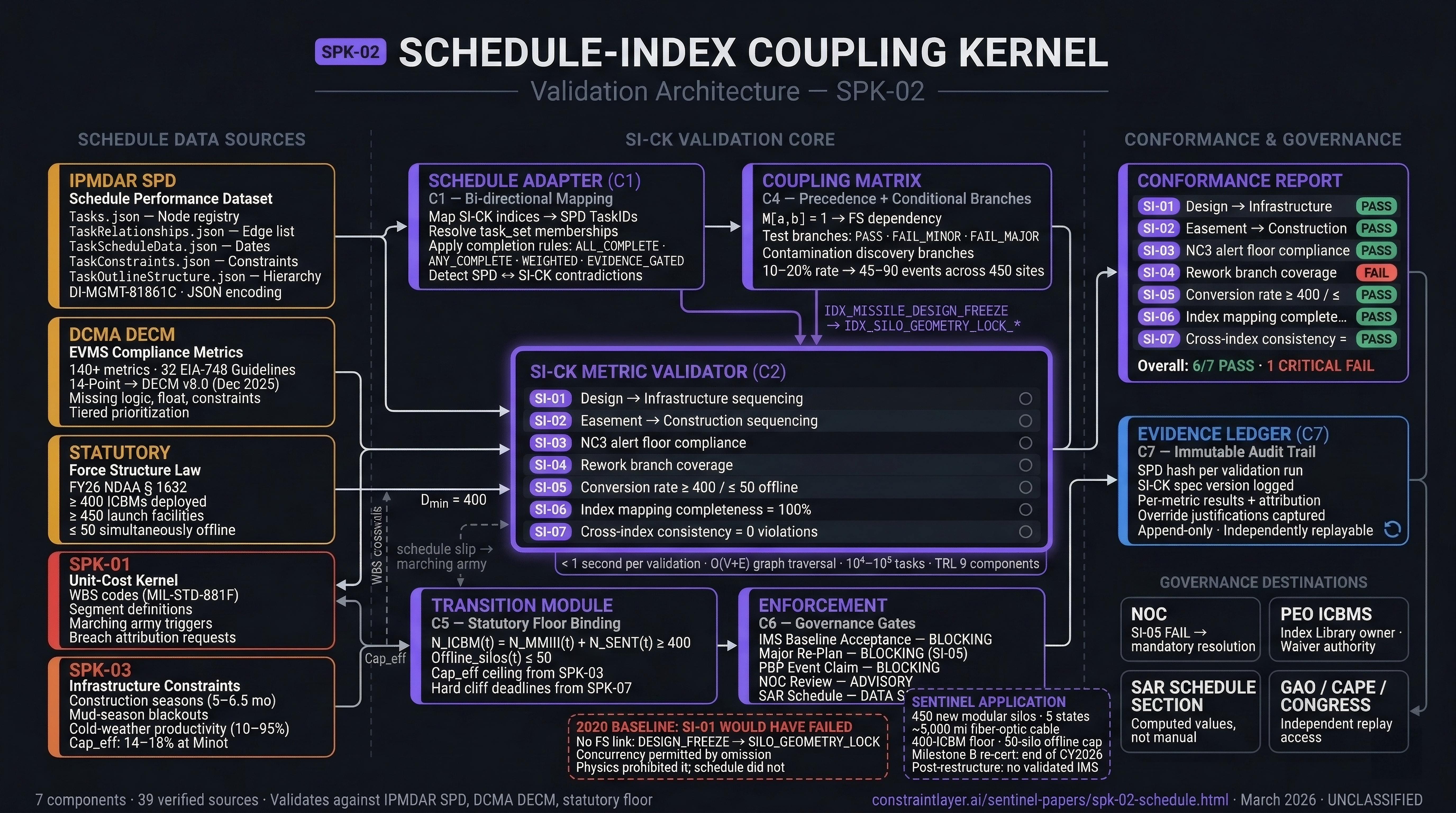 The Schedule-Index Coupling Kernel (SI-CK) is SPK-02 of the Sentinel Recovery Architecture. It is not a new scheduling tool, not a new enforcement mechanism, and not a replacement for existing governance. IPMDAR schema validation rejects malformed schedule data at upload.[9] DCMA's 140+ EVMS Compliance Metrics (DECM) detect logic flaws algorithmically.[10] Performance Based Payments gate contractor cash flow on milestone completion.[11] DFARS 252.242-7005 authorizes payment withholds for business system deficiencies.[12]