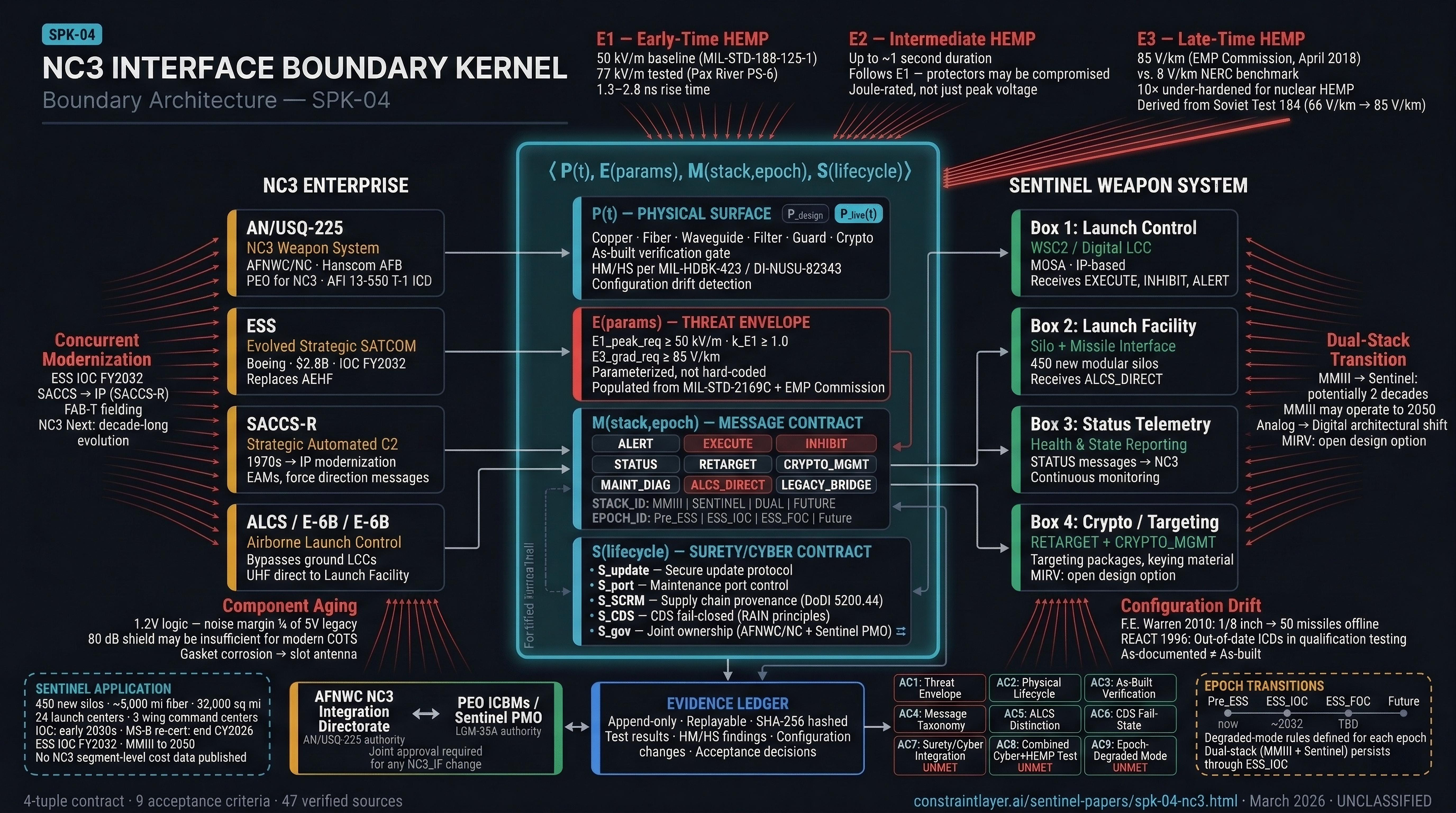 The interface where presidential authority flows to the weapon system and operational status returns to national leadership is the most consequential boundary in defense acquisition. Sentinel must integrate into an NC3 enterprise that is itself transforming — new satellites, new networks, new threats — while maintaining nuclear surety through a multi-decade dual-stack transition with Minuteman III. The EMP Commission recommends hardening to 85 V/km — an order of magnitude beyond commercial standards. NC3-IBK defines and validates this boundary.