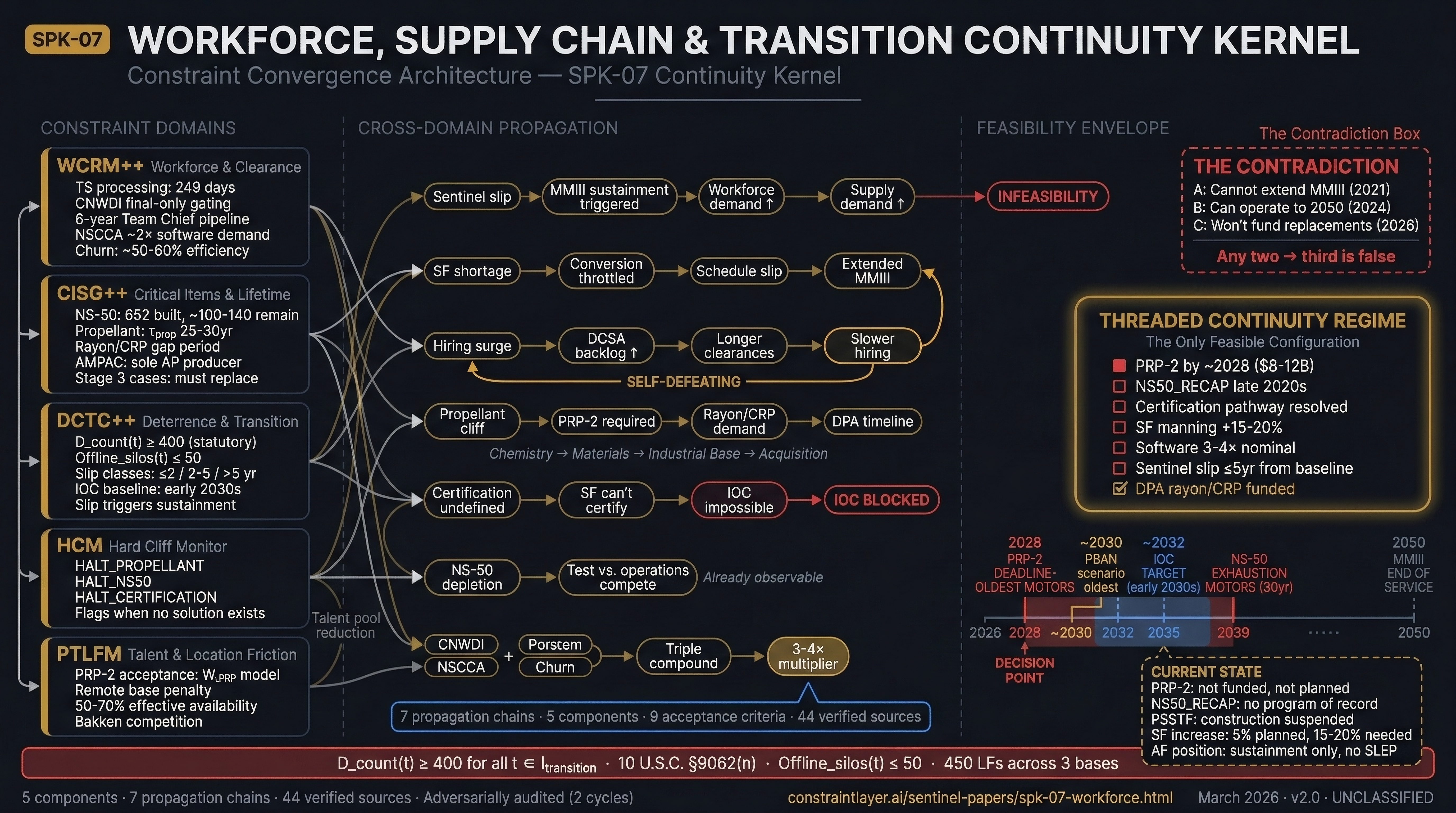 The United States is attempting to run two full-scale strategic missile programs simultaneously — sustaining Minuteman III through 2050 while fielding Sentinel — with an industrial base, workforce, and infrastructure sized for one. The Air Force assessed 2050 operation as "feasible" only if "entire subsystems" including propulsion and guidance are replaced.[2] Neither replacement program exists. Meanwhile, the propellant is aging toward a viability horizon that the Air Force's own assessment says requires action. Guidance spares are depleting — the Air Force is already reducing test launches to conserve parts.[13] The security certification pathway for Sentinel is suspended with no schedule. There is no viable path that both maintains 400 operational ICBMs and respects the Air Force's own 2050 feasibility conditions under current funding. WST-K identifies the only feasible configuration and the decisions that must be made by ~2028 — or the statutory requirement of 400 operational ICBMs[5] becomes physically impossible to maintain.